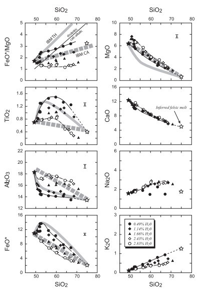 Para cada muestra sintetizada la fracción de fundido incrementa sistemáticamente con el incremento de la temperatura (e.g. Si y Fe) varia significativamente en el contenido de H2O (Fig. 6), con un resultado de cambio sistematico en la fase de abundante contenido de H2O (Fig 7). La cristalización de la tendencia de la plagioclasa y ortopiroxeno puede ser suprimida, mientras que cantidades de óxidos de Fe-Ti incrementan con el incremento del H2O. Bajas concentraciones de TiO2 y FeO* en fundidos pobres en H2O pueden así ser producidos por alta y baja abundancia de plagioclasas y óxidos de Fe-Ti, respectivamente (Figuras 7 y 8). Alta abundancia de ortopiroxeno con una fase de cristalización de alto grado de fusión parcial (Fig. 7) pueden considerarse para la observación de tendencias de SiO2 que son constantes en sistemas pobres en H2O (Fig. 8). Los datos de Na2O tienden a estar diseminados especialmente en pequeñas fracciones de fusión (Fig. 8), sugiriendo que el desenfoque del haz de electrón usado aquí puede todavía causar perdida de Na durante el análisis. Sin embargo, el tamaño de los grupos de vidrio presentes en estos experimentos no son lo suficientemente grandes para utilizar más haz desenfocado.