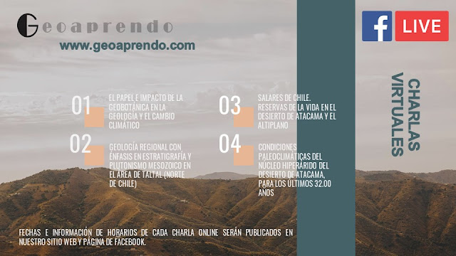 A partir de este Martes 18 de Mayo comenzaremos a transmitir vía Facebook LIVE temáticas de ciencias de la Tierra, donde charlistas de distintos países estarán entregando conocimiento sobre sus proyectos, trabajos e investigaciones de manera gratuita para la comunidad. Te invitamos a seguir el evento en Facebook donde se irán actualizando los horarios e información de cada charla ¡No te las pierdas!